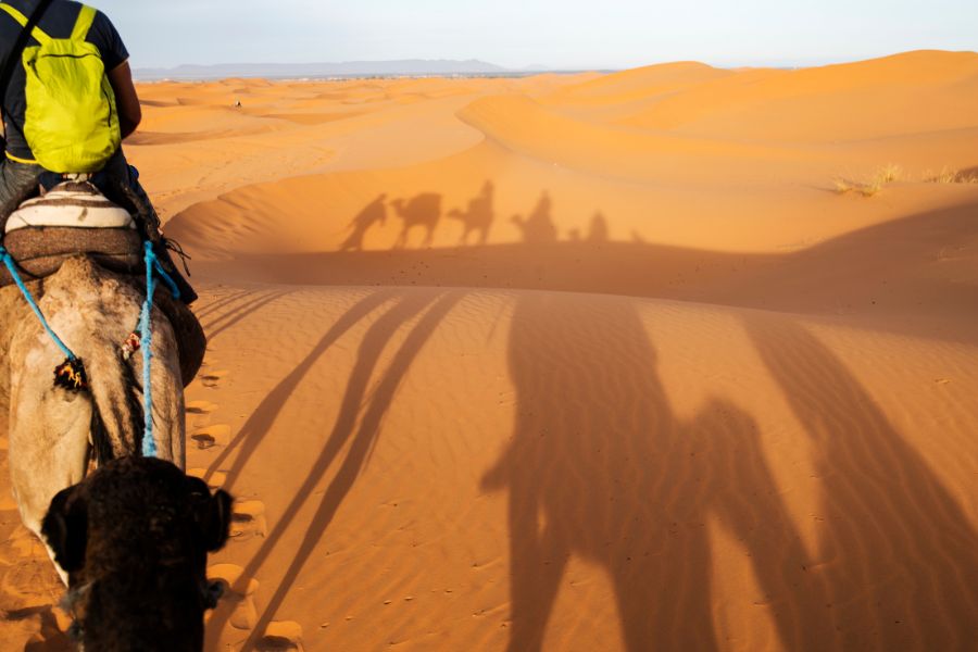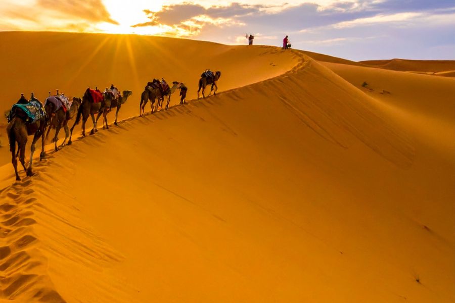 The caravan continues its journey towards the large dunes, crossing through virgin desert before reaching the Erg Zahar dunes to admire the sunset.
